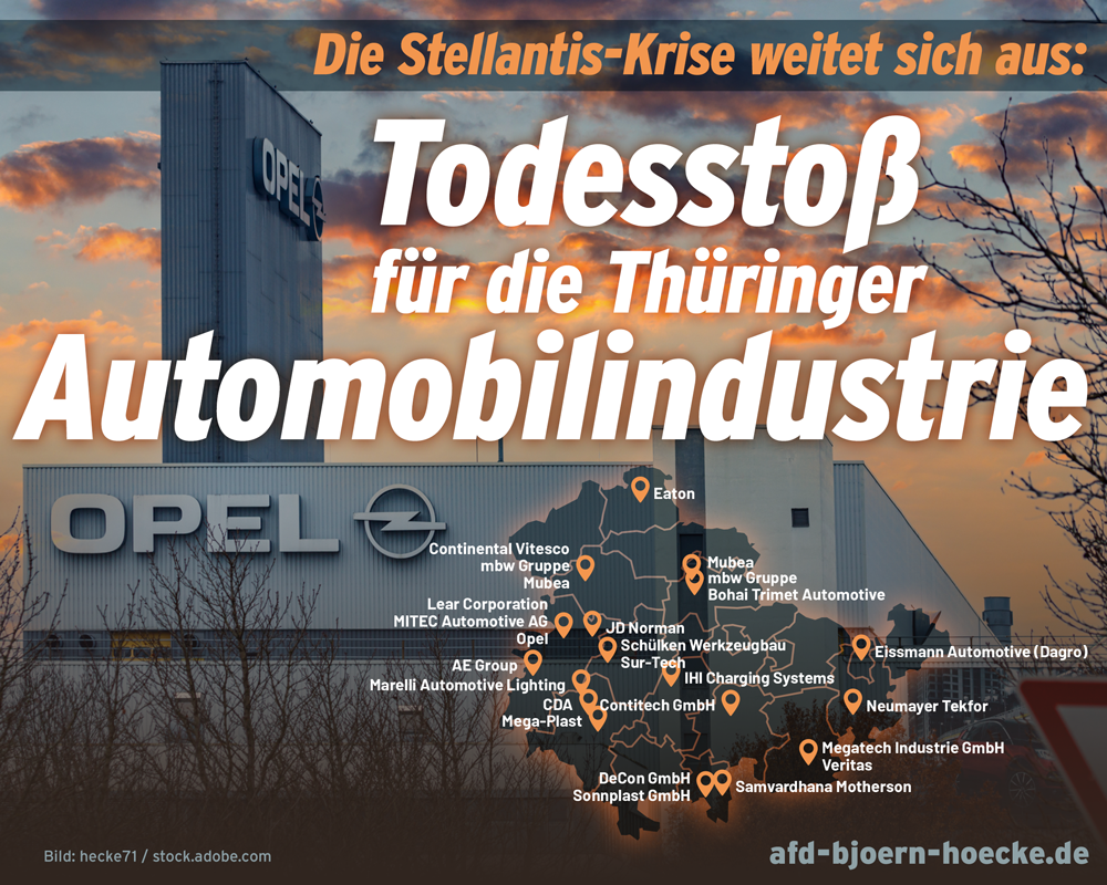 Erst vor wenigen Wochen stand das Aus für den Automobilzulieferer AE Group im Wartburgkreis endgültig fest: 550 Mitarbeiter verlieren ihre Arbeitsplätze, trotz fieberhafter Suche konnte kein Investor gefunden werden. Noch im letzten Jahr hatte Christian Kleinjung, der Vorstandsvorsitzende der AG, gehofft, den Standort durch ein Insolvenzverfahren retten zu können. Die von den Kartellparteien durch CO₂-Bepreisung und Rußlandsanktionen in die Höhe getriebenen Energiepreise schrecken Geldgeber aus dem Ausland ab. Zudem wirkt sich der Sparkurs bei VW negativ auf die Zulieferindustrie aus.