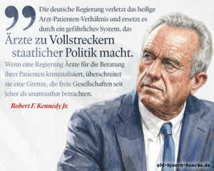 Der Fall der Ärztin Bianca Witzschel zeigt: Die Corona-Politik ist längst nicht aufgearbeitet und die heutige Faktenlage für die zum Teil verfassungswidrigen Maßnahmen findet bei deutschen Gerichten keine Beachtung. Im Gegenteil: Noch immer werden Ärzte verurteilt, weil sie sich an den hippokratischen Eid gehalten haben. Der Schutz der politischen Verantwortlichen scheint einigen Richtern wichtiger zu sein. Das sorgt inzwischen international für Aufsehen: Das US-Gesundheitsministerium hat eine informelle Beschwerdestelle für betroffene Mediziner eingerichtet. US-Gesundheitsminister Robert F. Kennedy Jr. sieht darin nichts anderes als politische Verfolgung, die es — gerade für Ärzte — in einer funktionierenden Demokratie nicht geben darf.
